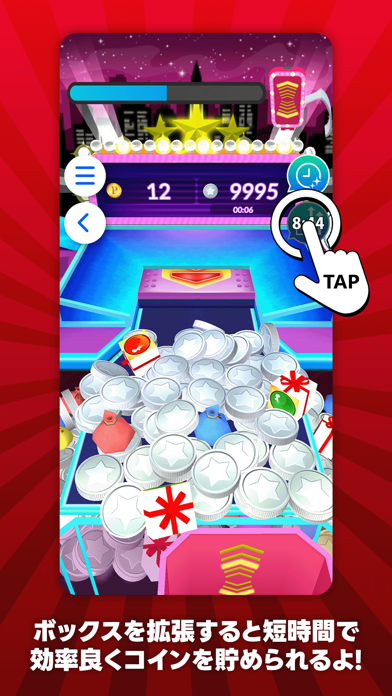 任意のタイミングでメダルを落とし、手前の動くボックスへメダルを入れていきます。たまにプレゼントボックスがあり、それを落とすと抽選開始。プレゼントボックスは、手前のボックスの外に落としてしまっても抽選参加できます。