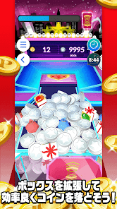 任意のタイミングでメダルを落とし、手前の動くボックスへメダルを入れていきます。たまにプレゼントボックスがあり、それを落とすと抽選開始。プレゼントボックスは、手前のボックスの外に落としてしまっても抽選参加できます。