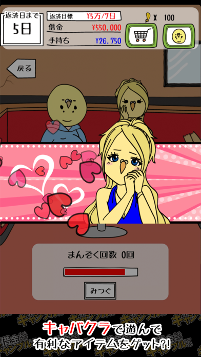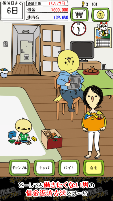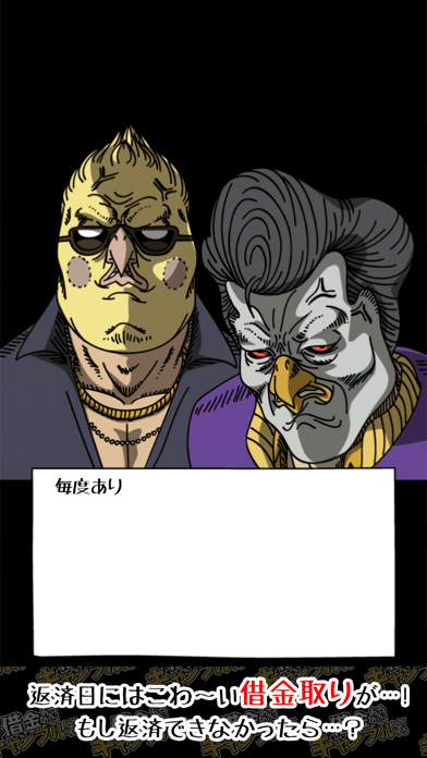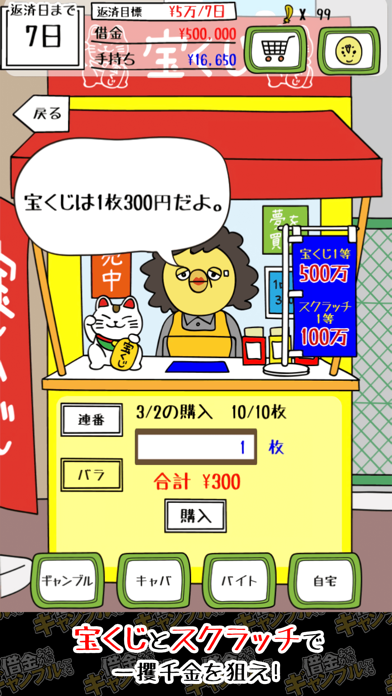 ギャンブル好きな主人公を操作して、借金返済を目指していくカジュアルゲーム。競馬、スロット、宝くじなどをエンジョイしつつ、手持ちのお金を増やしていきましょう。ギャンブルで勝ったらキャバクラを楽しむのもよし。競馬や宝くじでさらに大きな勝ちを求めてもよし。さまざまな遊び方ができてやり甲斐があります。