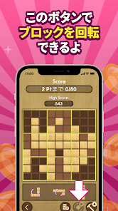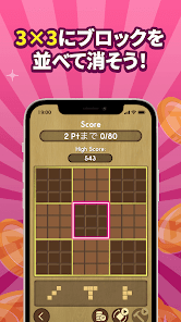 ブロックを縦横1列、または正方形9マスにはめると消去できます。広告を見てブロックを回転させたり、3×3マスのブロックを消去したりと便利なアクションが使用可能。スコアが高くなればなるほど、抽選で使うポイントが多く手に入ります。