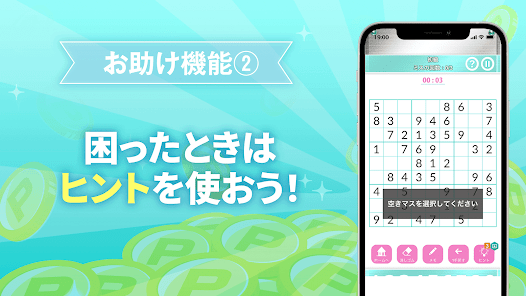 縦横の列に、1~9までの数字を入れていくナンプレ。消しゴムやヒント、メモ機能があり、遊びやすいよう設計されています。4つあるうちの難易度から自分に合うものを選び、ポイントを稼いでいきましょう。