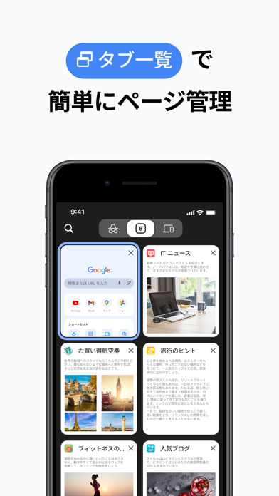 シンプルなデザインにより、多彩な機能を直感的に使えます。複数タブやブックマーク、広告ブロックなど基本的な機能はもちろん、カメラや音声からの検索も可能。欲しい情報をスムーズに検索し、快適なブラウジングが可能です。