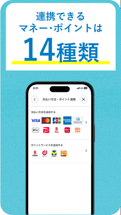 5種類のポイントプログラムも連携可能。楽天ポイントやVポイントなどと連携すると、ポイント支払いやポイント獲得ができます。また支払いは、PayPayをはじめとする電子マネーやクレジットカードに対応。連携した支払い方法でもポイントが貯まります。