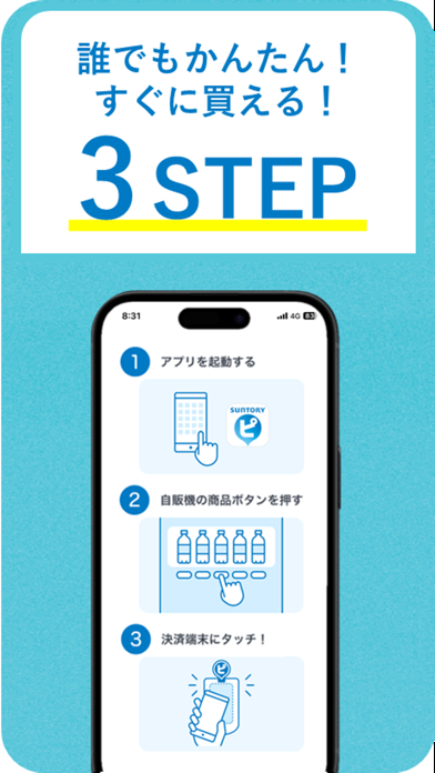 SMS認証と支払い方法の連携だけで利用開始。名前や年齢、メールアドレスなどの情報登録は不要。アプリ起動後に「ピ」マークの付いたサントリー自販機にスマホをタッチすると、商品を購入できます。釣り銭切れで買えないという心配もありません。
