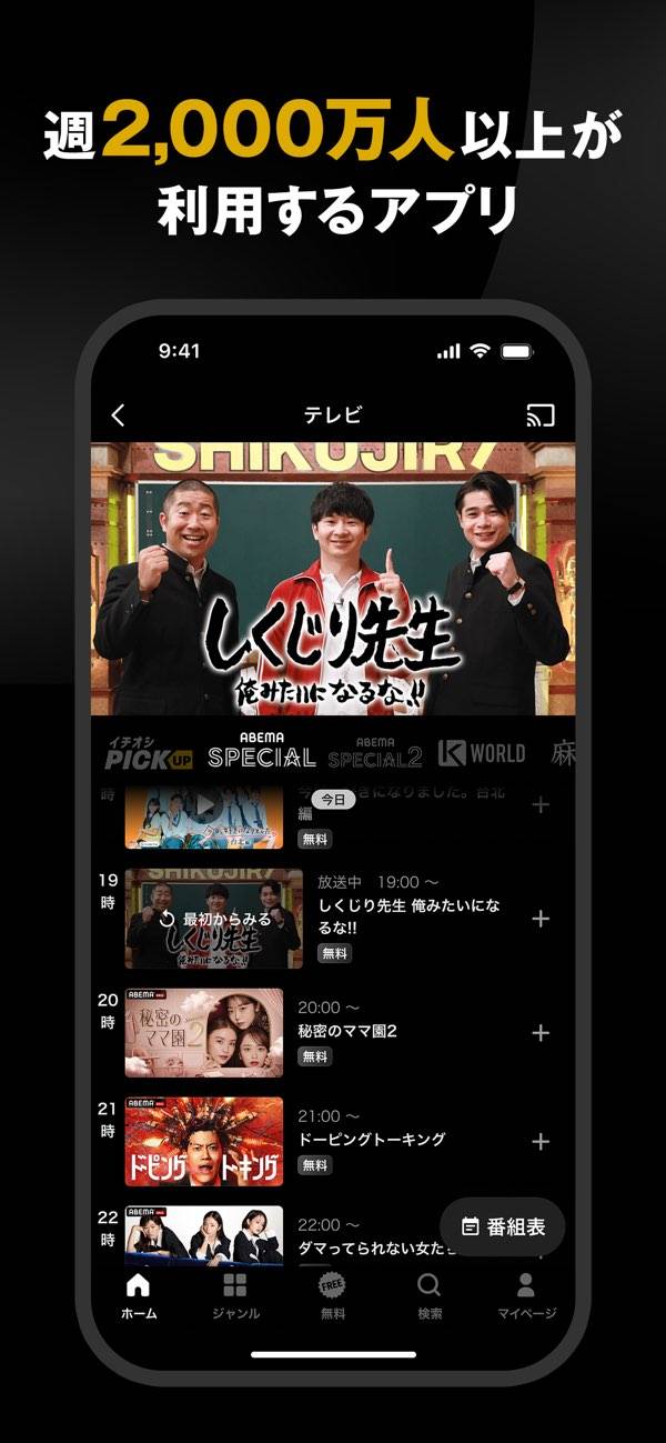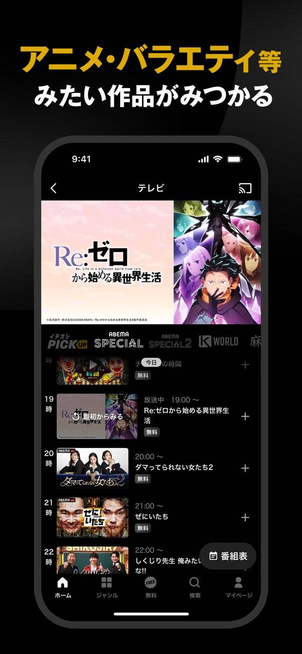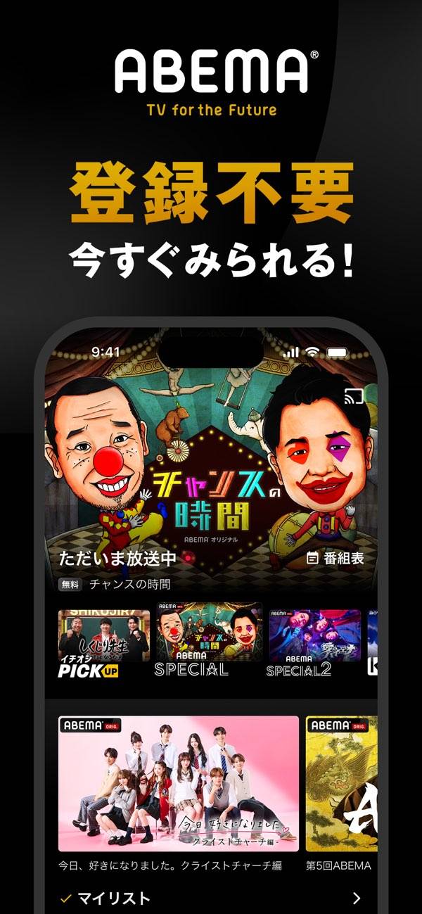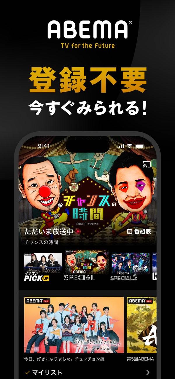 アプリをダウンロードしたらすぐに番組を視聴できます。アニメ、ドラマ、格闘技など多彩なジャンルが視聴可能。「今日好き」などここでしか見られない限定番組も多めです。私はバラエティー番組が好きなので、ABEMAオリジナル番組の「チャンスの時間」を視聴するためにアプリを使っています。会員登録なしですぐに番組を楽しめるのは便利。