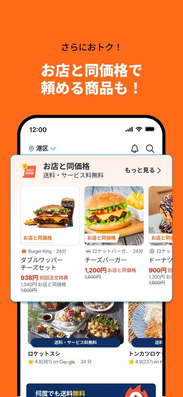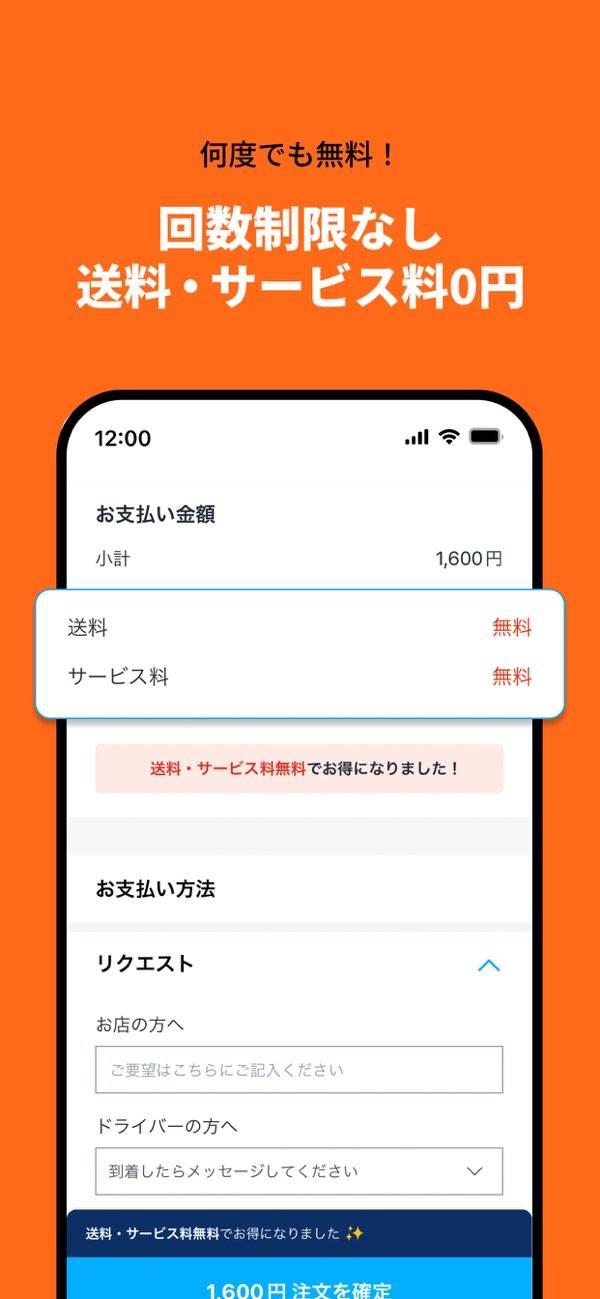 ほかアプリでは料理代以外に配送料とサービス料がかかりますが、本アプリでは無料。「1,000円の料理なのに、支払いが1,500円になっている」なんてことはありません。ちょっとごちそうを食べたい気分のときも、余計な費用を気にせず注文できます。