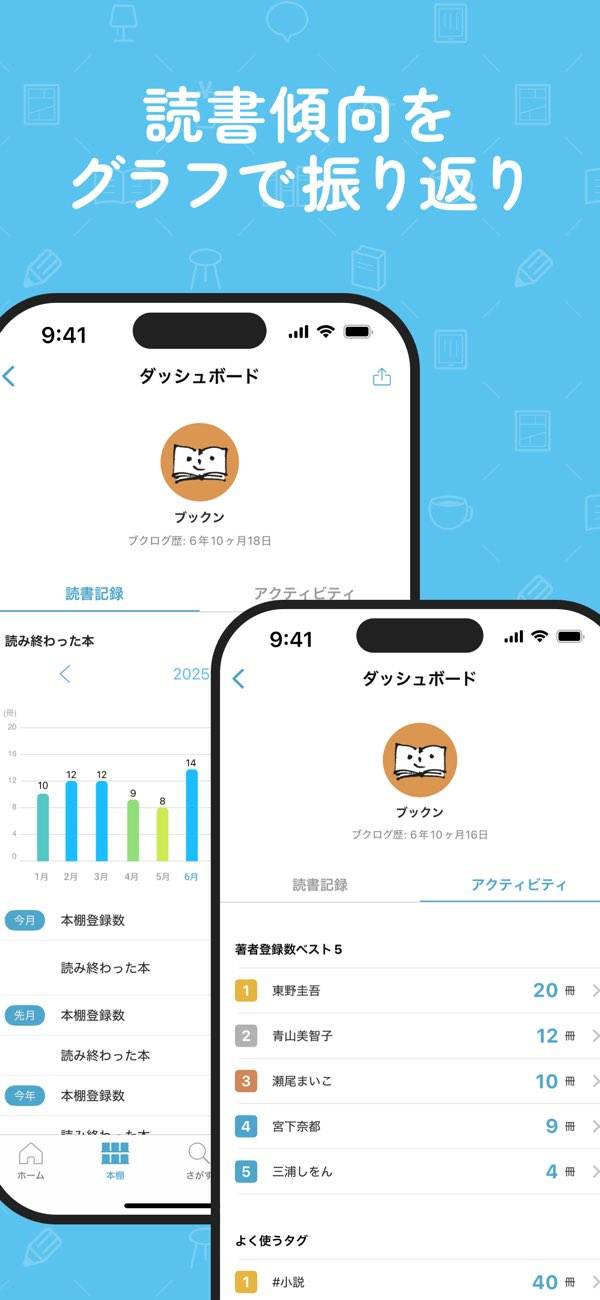 ダッシュボードでは、読書の振り返りができます。1か月の読んだ冊数や著者別の登録数の振り返りができ、自分の読書傾向を知りたいときに便利です。また読書メモ機能を活用して、読み終わった本の感想を残してみてもいいでしょう。