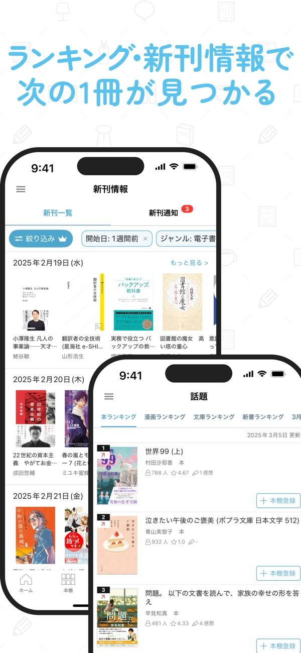 読み終わって評価した本の傾向から、おすすめの本を紹介。またブックリストをチェックすることで、今まで知らなかった本を発見するきっかけにもなります。ランキングや新刊情報の中から、素敵な本との出会いを楽しんでみませんか。
