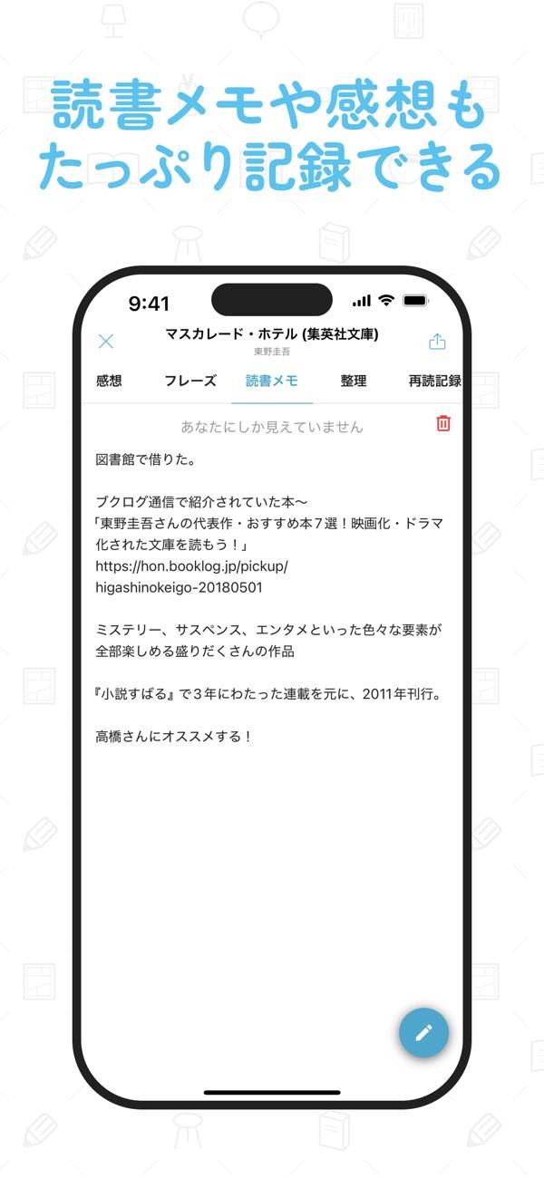 - 自分だけが見られる読書メモを残せるので、後で振り返る際に便利
