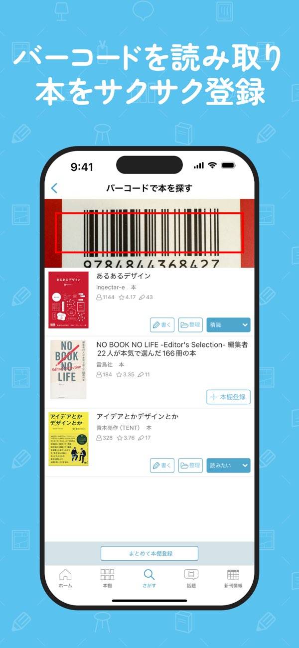 - 登録した本は表紙を並べて一覧表示。バーコード読み取り機能もあり