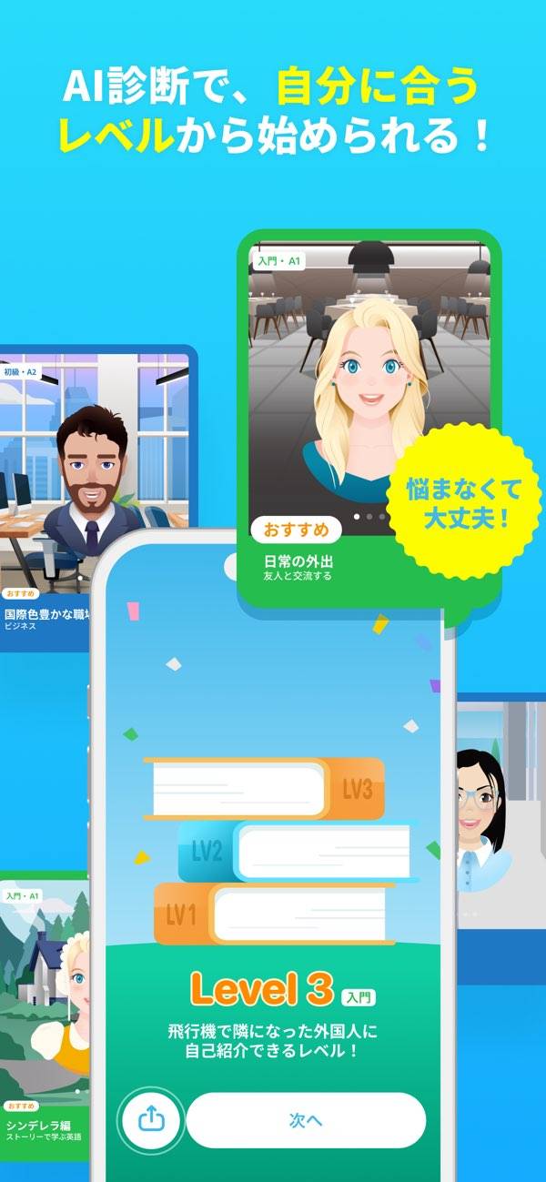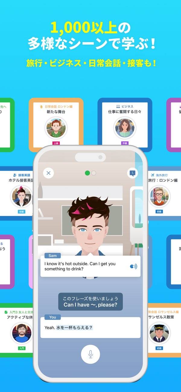 あなた専用のAIトレーナーと、心ゆくまで英会話!日常英会話からビジネス英会話まで、学びたいシチュエーションで繰り返し会話することで、しっかり英会話力が身につきます。