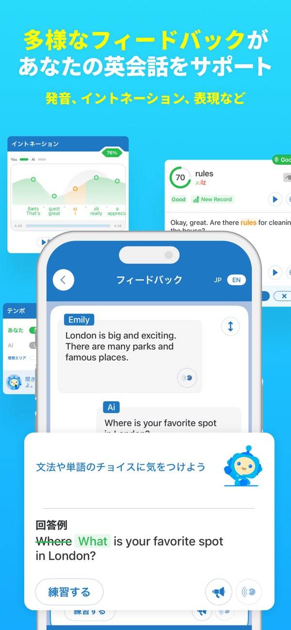 『スピークバディ』がほかのAI英会話アプリと一線を画すのは、その高精度な音声認識機能です。音声入力の誤訳によって会話がズレるというストレスをほとんど感じません。認識精度の高さは、フィードバック機能にも活きており、発音や文法の改善点をリアルタイムで教えてもらえます。