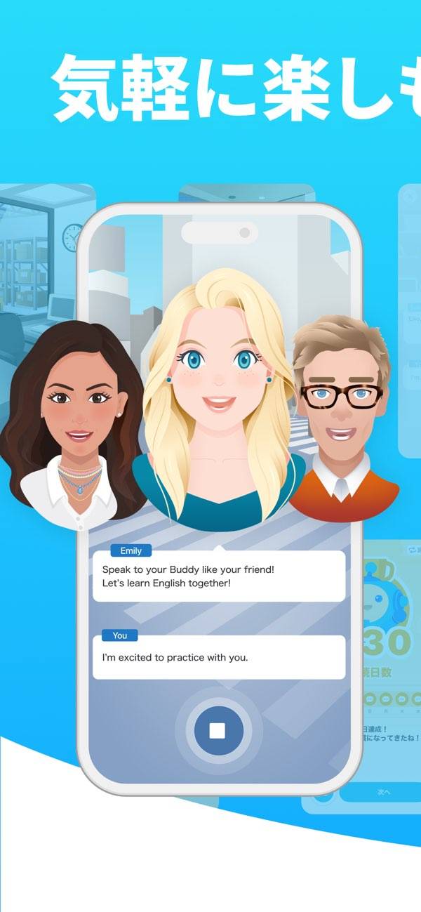 アプリの最大の特徴は、キャラクター(バディ)と一緒に楽しく会話しながら、学びと実践の機会を得られることです。