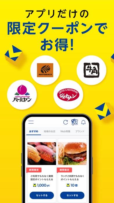 アプリ限定のクーポンを利用できます。対象店舗はファーストフード、ファッション、カーライフストアなどさまざま。使いたいクーポンを選んで「セットする」を押しておくと、バーコード提示時に条件を満たした場合、記載されているポイントを獲得できます。