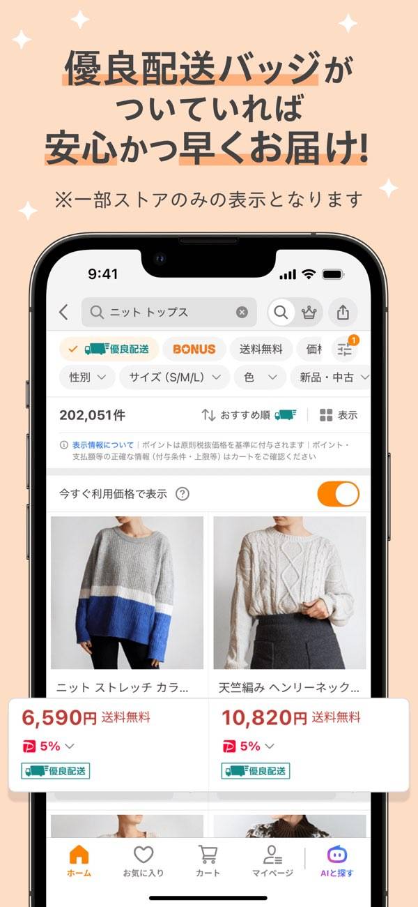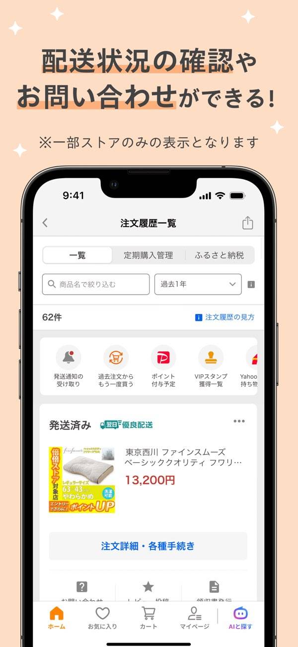 商品を探すのに便利なウィジェットや、発送通知などのプッシュ機能が充実。検索履歴やおすすめ表示で、関連する商品もどんどん見つけやすくなります。荷物の状況もひと目でわかるので、通販にありがちな「いつ届く?」の不安もありません。