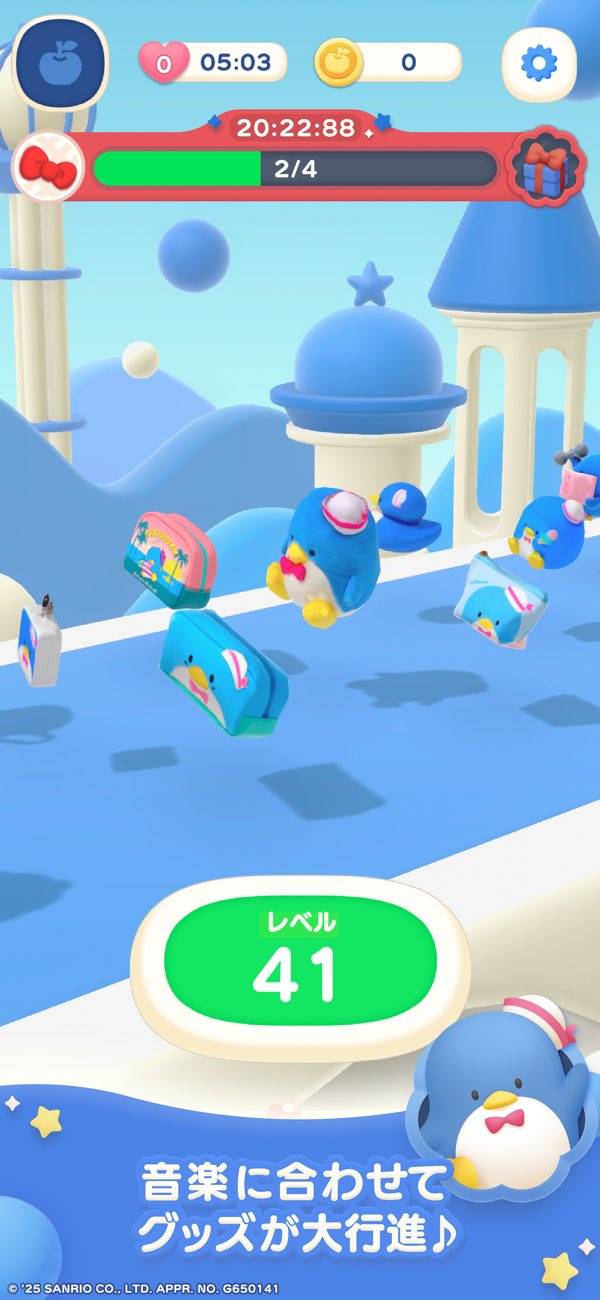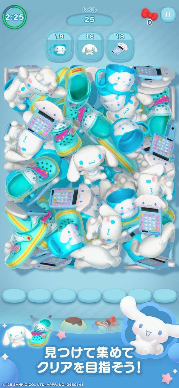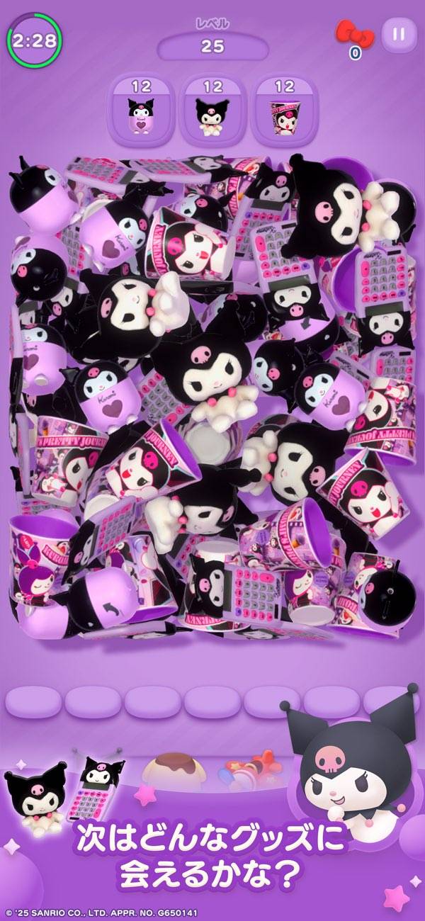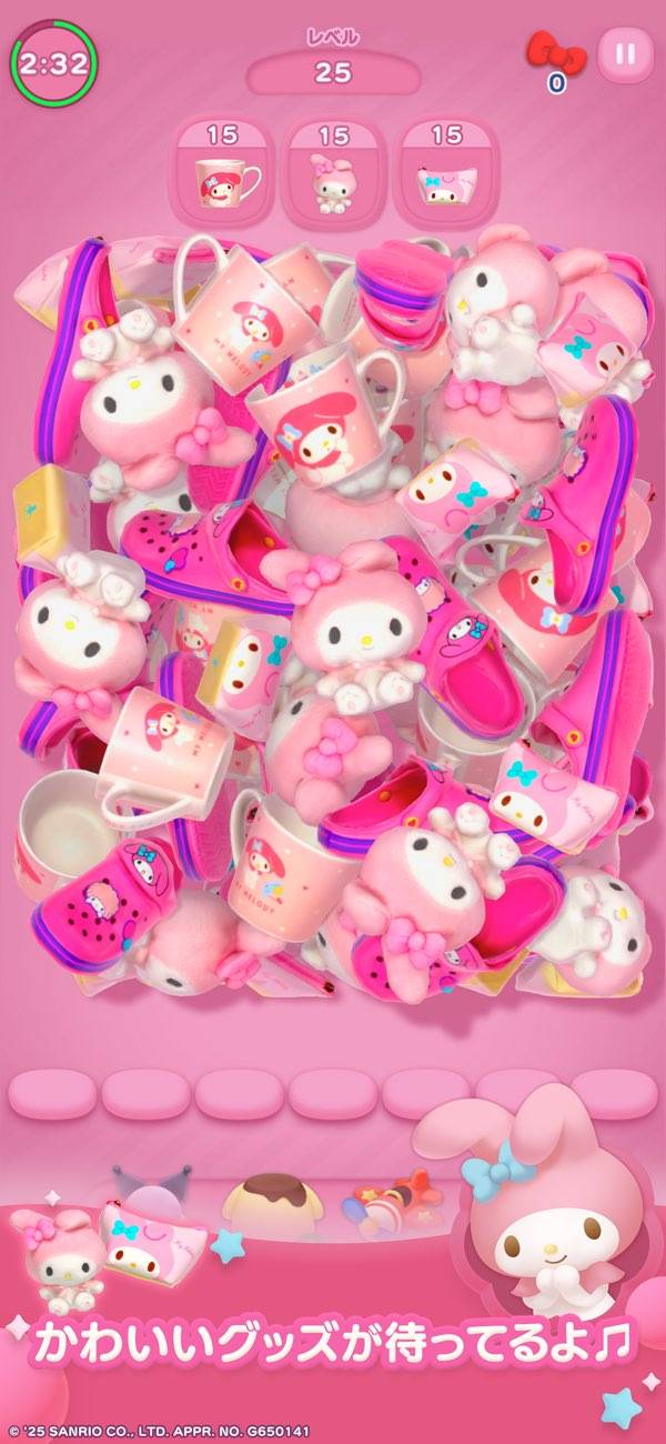 散らばったグッズの中から、同じグッズを3つ集めてマッチ。画面上部に表示されているお題のグッズをすべて消すとクリアです。サンリオキャラクターのグッズで画面が溢れ、とてもかわいらしいです。